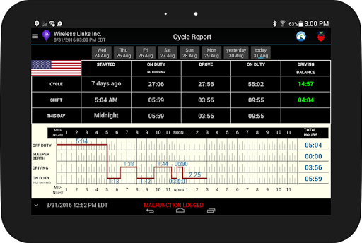• Automatically calculates and displays current and available driving and on duty time in drivers’ shift and cycle.