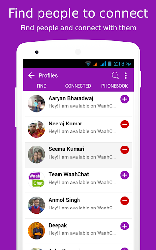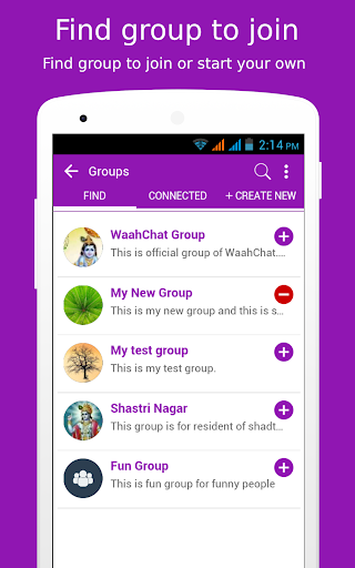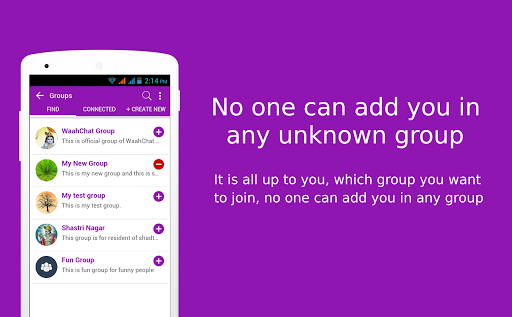 WaahChat is loaded with lots of cool features. Browse people available on WaahChat with either name or their contact number and send them a connection request. Upon approval of connection request from other side, start chatting and make new friends. You can also join any existing group or create your own group and invite people to join your group.
