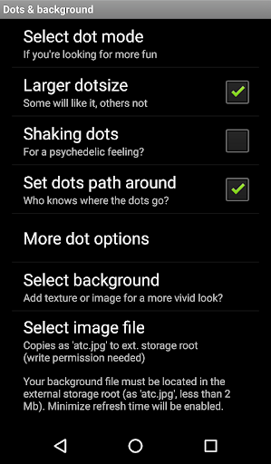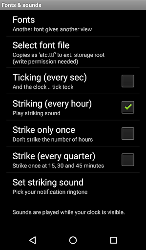 To use your own font, download the font of your choice, select the font file via the 'Select font file' option. Also select the [file font] item from the list of available fonts via the 'Fonts' option. You can also manually put your ttf or otf file in root of the external storage (as atc.ttf of atc.otf). Note: this is the same trick to get your own background (with atc.jpg).