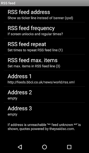 An optional RSS feed can show you feeds as a ticker line at the banner position. You should therefore enter the full web address of the desired feed. You can adjust the frequency, recurrence times and max. number of items of the feed line. You can store 3 addresses so that you can easily switch if you wish. If the RSS feed is enabled, it will show every time your screen is unlocked and optionally every 2, 5, 10 or 15 minutes.