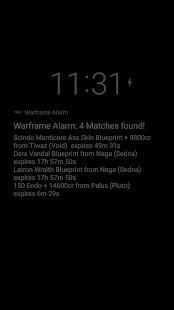When the Service is enabled the app will periodically grab results from the Digital Extremes Warframe stats server for analysis. If a match is found the app can Notify you in several ways: ring an audible alarm, send Standard Android Notifications, or vibrate the device and flash the LEDs. This lets you know its time to play the game.. if you can do so within the expiration period given for each reward you will have a chance to win the desired resources. The Service on your device that grabs the data can be enabled or disabled from the main view in app.