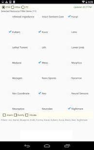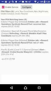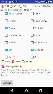 This app lets the Warframe player choose the game platform ( PS4 / XBOX1 / PC ) and select from over 80 resource items to be used as search filters from the current items rewarded in Events, Alerts, Invasions, and Plains of Eidolon reward pools (Bounties, Ghoul Purge, and Plague Star). These items change often in Warframe and you may lose out if you are not playing 7x24.