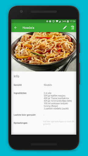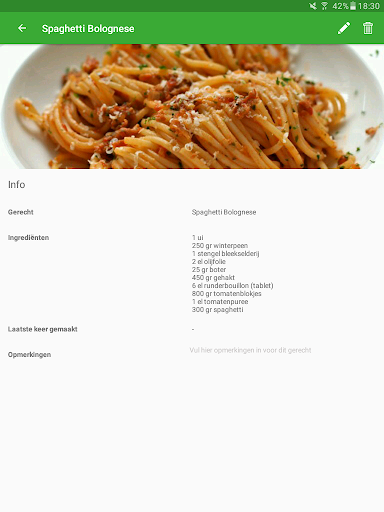 Ook is het mogelijk om ingrediënten bij de gerechten te noteren zodat je de app kan gebruiken als referentie voor de hoeveelheden die je moet kopen.