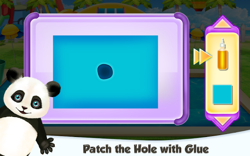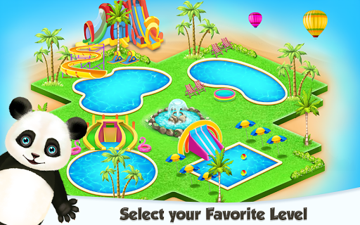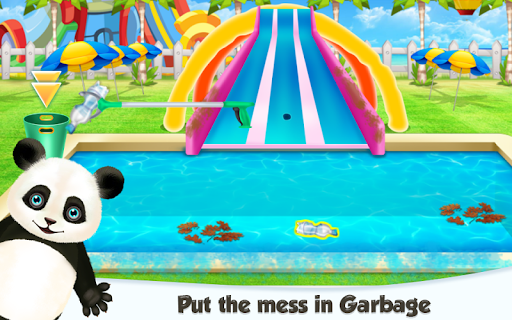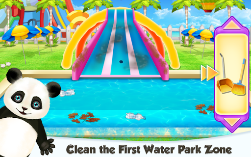 This lovely panda bear is so sad and he needs your help to restore a water park so he could play and swim all day long. You will be using interesting tools and besides the chores that will be assigned to you, there will be a part in which you will let the panda slide and splash in the new and cleaned pool space. Try to use your skills if you have any, but if you don't, there will be plenty of time and opportunities to get to know the procedures. First, you will be cleaning the space, then you will be having the playing time with the panda. Begin with the square shaped pool and find what challenges are waiting for you in there. Seems like there are some like cleaning the garbage that is in the water, making the margin clean and water free, swelling the slide part that needs reconstruction and repairing the hole that is in it. Move to the further sections and clean the pools that are differently shaped. Maybe you will meet other challenges like removing the leaves or replacing the unfunctional pipe. Either way, you should use the tools we've provided. Follow the instructions and you will encounter no problem with the cleaning. After each stage, you will let the panda bear get a ride and have fun with the newest toys and waterslides this park has to offer. Try to have as much fun as he is having on this watery day.