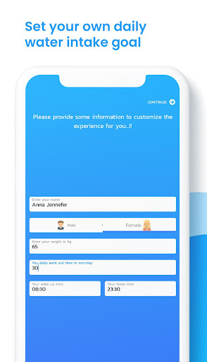 1) Water Calculator – Automatically calculates your recommended daily water intake based on your gender and weight. 2) Water drinking reminder – Water reminder app will remind you to drink water during the day at desired intervals so you never get thirsty and experience dehydration. 3) Statistics – Drink Water Reminder app keeps track of your daily water intake