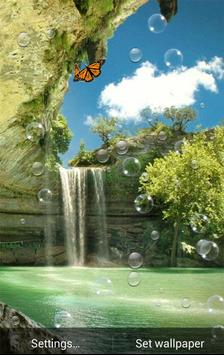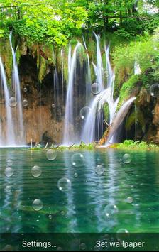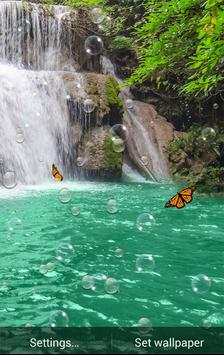 Waterfall Wallpaper HD is a vivid picture of waterfall wallpaper with many raindrop on screen and some butterflies flying across and many bubbles which broken when you touch it .