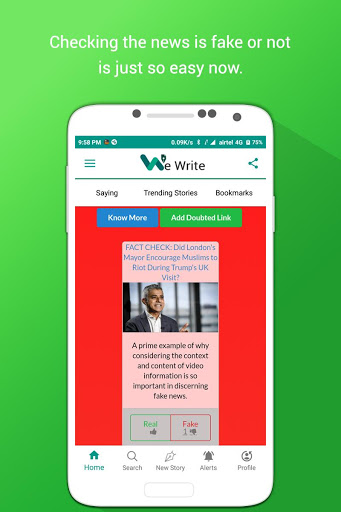 WeWrite's FakeCheck is a revolutionary approach to fight fake content (News, Article, Videos, People) that is blooming over the Web and is really dangerous. With Wewrite's FakeCheck you can just add a link that you doubt to be fake, and that's it you are done, our algorithm & community members will vote the link whether it's real or fake. 96.3% of time it's accurate.