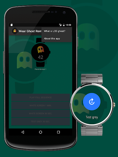 This app may help you remove LCD ghosts from your Android Wear watch screen. We don't guarantee effect, but methods of relaxing liquid crystals in LCD displays combined in this app helps in many cases. This app is designed especially for Moto 360 watches but works well on other Android Wear devices - it's usefull only if your watch have LCD display just like Moto 360. It's useless if your watch have OLED, AMOLED or E-ink screen.