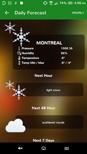 Weather forecast searches for your address automatically and provides the current temperature, current weather condition,humidity, pressure and dew points in addition, next hour, next after fourteen hours, after 7 days and hourly weather forecast.