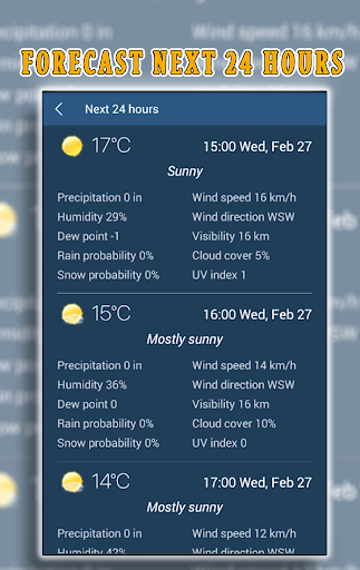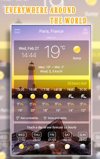 Weather forecast detects weather in your current location automatically. There are many information in weather forecast which includes weather condition, atmospheric pressure, relative humidity, visibility distance, precipitation in different unites, dew point, wind speed and direction, in addition to ten days future forecast, also hourly weather forecast, the weather for tomorrow, wether report, 14 day weather forecast, national weather!