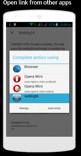1. Touch the web page link on any application then it will show browser list, select weblight and it will open the web blight trans-coded page