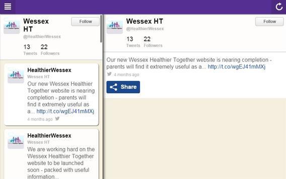 This app will give you quick access to the content of Wessex Healthier Together's website, Facebook feed and Twitter feed.