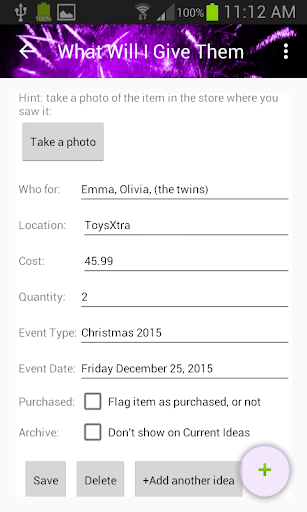 It's a simple idea: As you are walking through a store, and you see something you think you might give to someone, you record your idea in this app by taking a couple of photos of it, write a brief description of it, record who you think it might for. You can also record the price and store details.