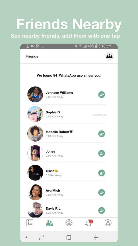 WhatsNum users can accept new friend requests, add new friends from closest to farthest.