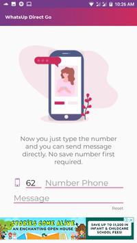 WhatsUp Direct Go is an Application that useful to send whatsapp message to phone number without having to save phone number as contact first. Now you just type the number and you can send message directly. No save number first required.