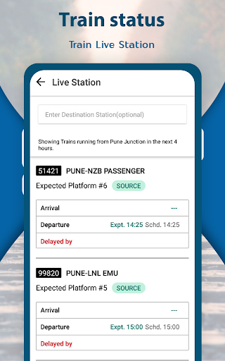 Check live train status to know if the train is running timely or late. Passengers when sitting inside train can also check train running status offline for which no internet & GPS is needed! This saves battery usage also. Know all trains arriving or departing at any station in next 4 hours with live station status. This feature is an extension to train running status in internet mode. Also check railway time table, historical platform number and average delay of any train at all its stops. Check your train distance to station.