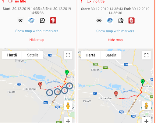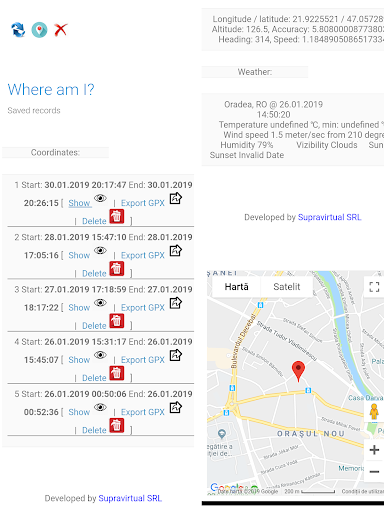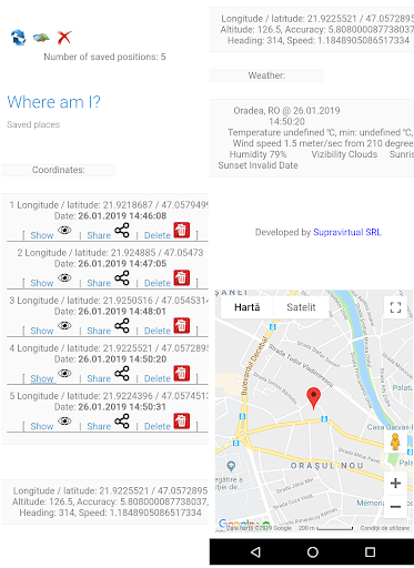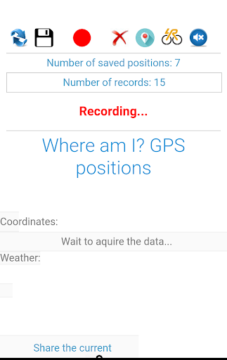 The application show and store (with a description and an image) the GPS coordinates and the weather conditions for where you are. You can share them with the world (online or trough sms) or you can save and share them later. You can record your route and export it into GPX format to be used with other apps or sites.