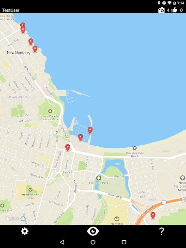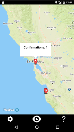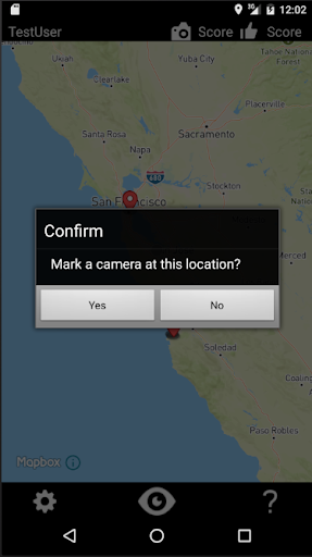 When run, the map will display red pins on cameras near your location. To mark a new camera, or verify that a marked camera exists, just stand near it and press the "eye" button.