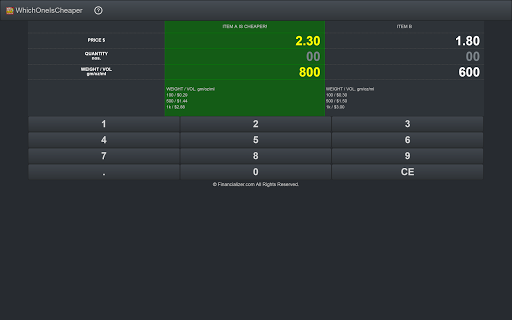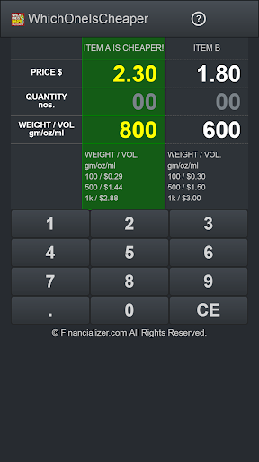 Quickly see the best and cheaper price of a deal. For e.g. A 675g bread for $1.88 or a 550g bread for $1.50: Which one is cheaper? Or, 8 chocolates for $2.80 or 12 for $3.99: Which is cheaper overall?