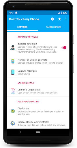 Don't touch my phone detects and alarmed who tries to unlock and open your phone without your permission. It alarms when someone tries to touch or disconnect the charger or open certain apps without your permission. When the alarm is on the intruder cannot reduce the alarm volume and notify you even the phone is in silent mode.