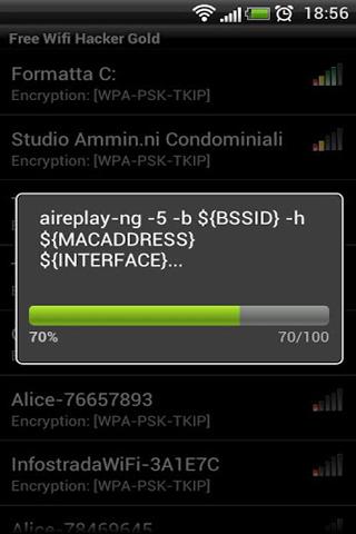 Wi-Fi hacker is the ideal app that simulates gaining access to Wi-Fi networks.If you found a network and you need to know its password this is the ideal app for you. In a few short steps by running an automated script the app will reveal the password.★ ★ ★ TIPS ★ ★ ★ ✓ Choose the network you want to crack by selecting it from the list.✓ Press the crack button to hack the network of choice.✓ In the next window press -start- to begin hacking the network.✓ An automated script will be run, accompanied by step and progress description.✓ You can cancel it at any point by pressing the -cancel- button.✓ Once the hacking is complete the password is revealed.✓ You can scroll the -mobile console- to see the contents and progression of the script.✓ To pause the automated script just enter the main menu.***PLEASE READ BEFORE YOU download **This is only a prank app. Any unpermitted hacking of a network with a real app would be illegal. This is just an elaborate prank app that will give you random passwords and the occasion to fool your friends.*******