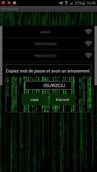 This is the wifi hacking application for fun. Make a fun with your friends and family. Look like a hacker. Make your friends fool that you are a hacker and going to hack wifi. This application will show you all available wifi networks and will click on it, a real like processing will start and at the end a password will be shown.