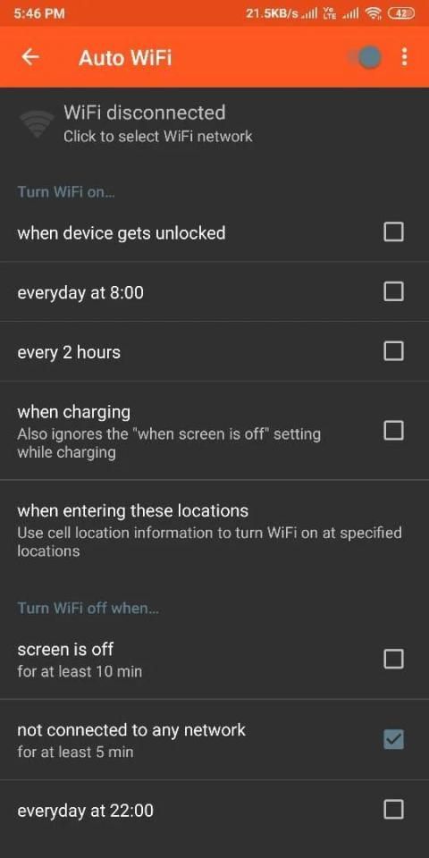 You can also specify to automatically turn on WiFi again, if you turn on your device or when you enter a specified location (requires a cell radio and therefore does not work on WiFi-only tablets!). Also, the app can regularly scan for available networks to connect to and re-disable WiFi if no suitable network is found. This way, you are always connected to your WiFi network when using the device.