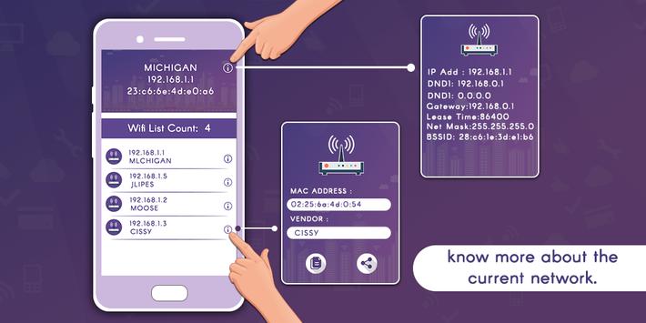 With this feature, you can check all the available wifi within your device range. It provides MAC Address and name of vendor of all the available connection of wifi.