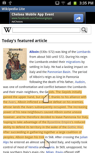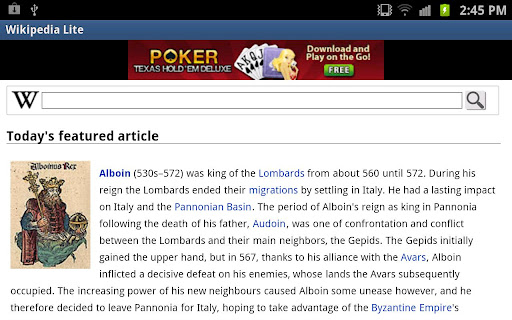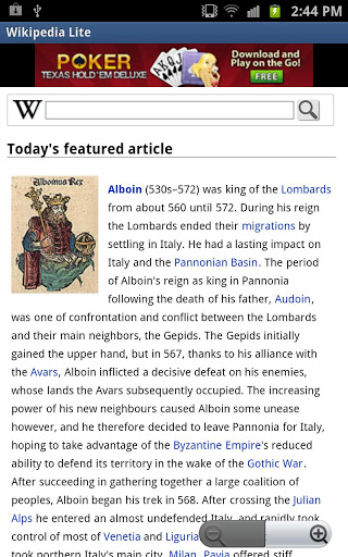 Wikipedia Lite App for android Light and Easy.Wikipedia is the free encyclopedia containing more than 20 million articles in 280 languages, and is the most comprehensive and widely used reference work humans have ever compiled.Features : Ability to Copy Text to Clipboard, Zoom Controls and many more. Like us on facebook facebook.comfreetop10ebooksFollow us on twitter twitter.comfreetop10ebooksIf you can39;t start the app from your app menu, try restarting your phone. This is a known problem with Market updates on some Android phones.If you have any problems with the app, contact us at http:freetop10ebooks.comcontact we39;ll be happy to helpThis free app is not associated with Wikimedia.