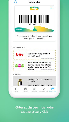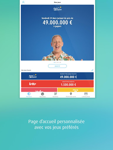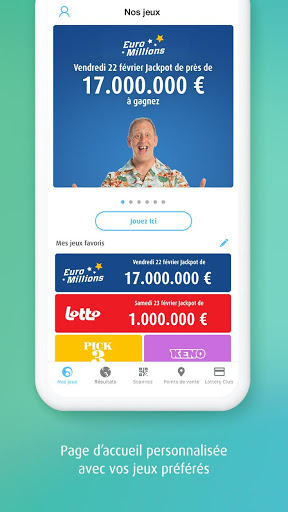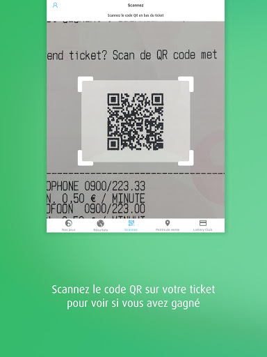 Avec l’app gratuite de la Loterie Nationale (la nouvelle version de l’app WinCheckr), vous placez vos jeux de tirage, jeux de grattage et jeux Woohoo! favoris sur votre écran d’accueil personnalisé. Jouer dans l’app n’est actuellement pas possible. Vous pouvez jouer en ligne via e-lotto ou chercher le point de vente le plus proche. Après chaque tirage EuroMillions, Lotto, Extra Lotto, Joker , Keno ou Pick 3, il vous suffit de scanner votre ticket pour savoir immédiatement si vous avez gagné. Vous pouvez également ajouter votre carte Lottery Club dans l’app : de cette manière, vous avez vos avantages toujours en poche !