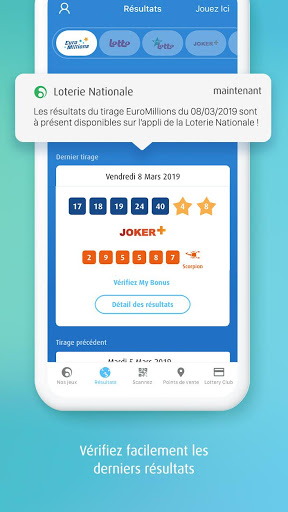 Soyez directement informé des résultats des derniers tirages EuroMillions, Lotto, Extra Lotto, Keno, Joker et Pick 3. Vous pouvez facilement comparer les numéros gagnants avec votre propre combinaison de chiffres. Et vous pouvez aussi directement regarder la répartition des gains.
