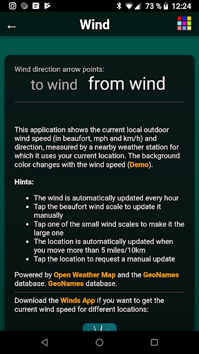 Do you want to go sailing, windsurfing, biking, kting, drone flying or just out of the door? This application shows the current local outdoor wind speed (in beaufort, mph, km/h, m/s and knots) and direction, measured by a nearby weather station for which it uses your current location.