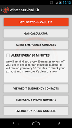 You can use the Winter Survival Kit app to store important phone and policy numbers for insurance or roadside assistance. You also can designate emergency contacts you want to alert when you become stranded.