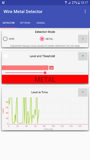 the App does analyze small changes in the ambient magnetic field. Therefore, in order to detect any metal, the device should be constantly slowly moving around objects. The bigger metal object, the more detection distance will be. Detection is working only if moving occurs.
