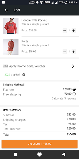 - View cart, view cart items, add products to cart, delete a product from the cart, apply coupon code and checkout.