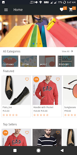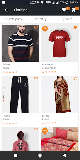 - View Categories and associated products. Change grid view and list view with product thumbnail, name, price and description