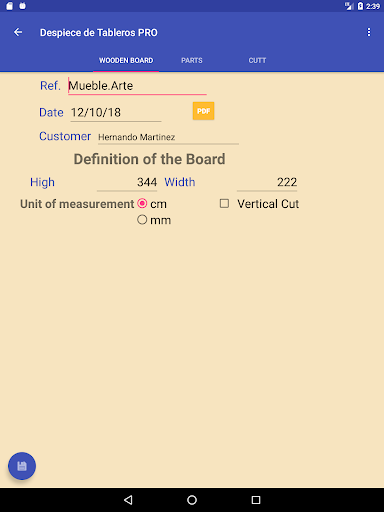 In the next version will be available the option to share by e-mail or by whatsapp the definition of all the cuts of the board, besides the type of board and the color.