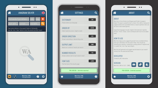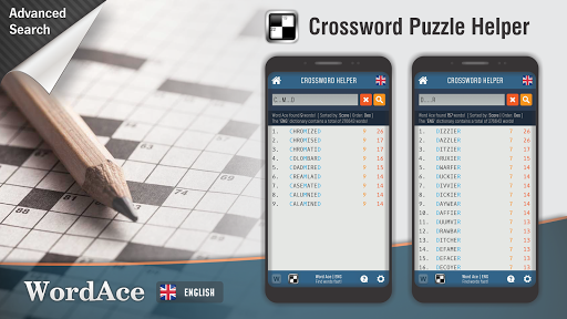Word Ace is the ultimate English word finder, anagram solver and crossword puzzle helper. The app is a powerful tool to find and suggest words from scrambled letters or search patterns in the dictionary that can be used in various word based games. The app makes use of an English dictionary containing over 275,000 words!