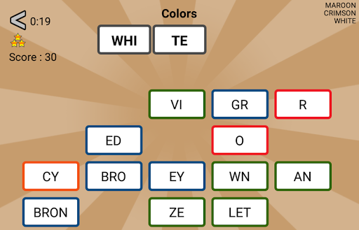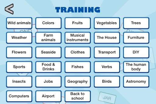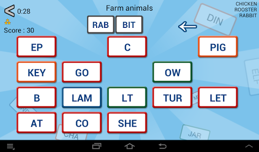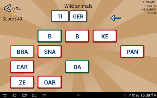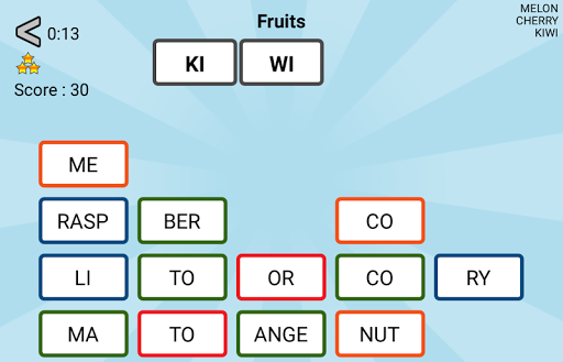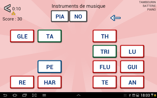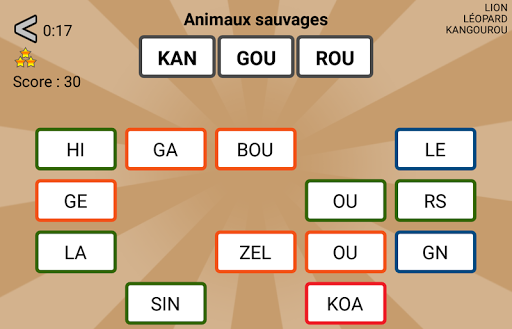 The goal of these word games : build words with the proposed syllables. In each game, words belong to a specific category.