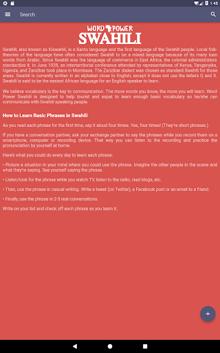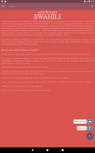 Word Power Swahili is suitable for tourist visiting Southeast Africa, including Tanzania, Kenya and the Democratic Republic of Congo. It’s help you to communicate with locals for your daily activities. If you have any plan to visit to Southeast Africa, then it’s a good place to start.