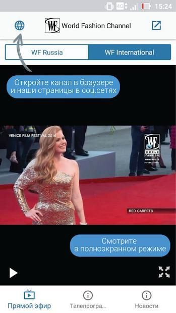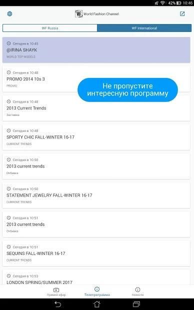 В приложении доступен прямой эфир World Fashion Russia и World Fashion International, а также программа телепередач.
