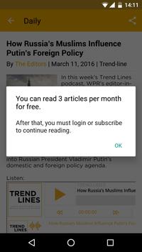 This app includes access to three free articles per month. To access more than seven articles per month, purchase an in-app subscription. The subscription also includes full access to the World Politics Review website (if email address is provided). Choose from two subscription plans: a quarterly term for $17.99 per quarter, or an annual term for $59.99 per year.