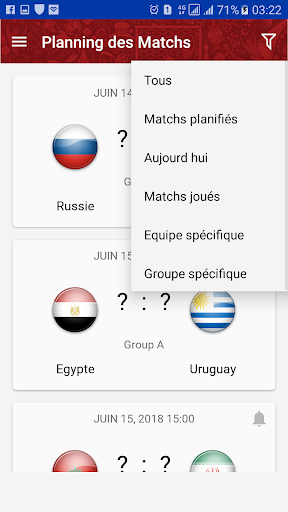 Fixtures/Live: List of matches are grouped by Team or by group. The time is converted to the current device Time Zone