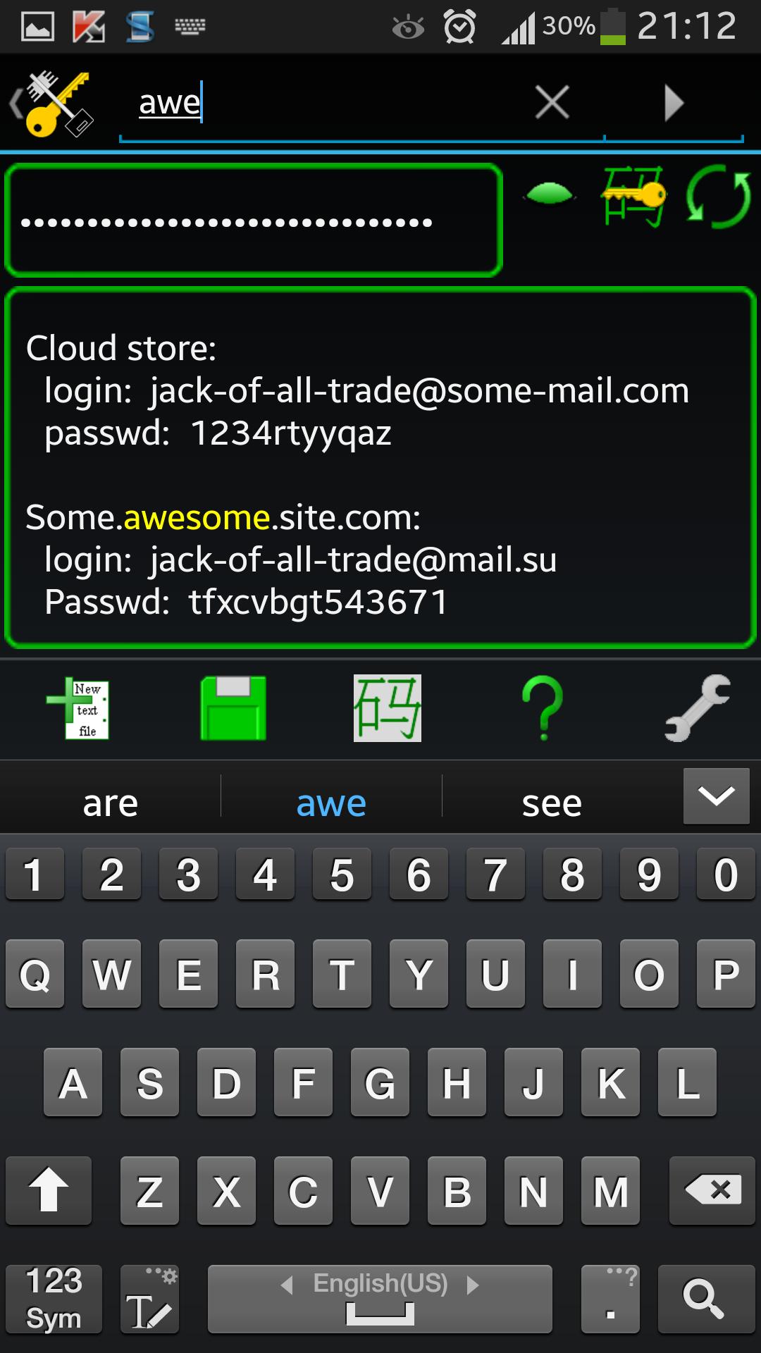 1. Create and edit encrypted text files. Such files are useful to store private textual information, such as: passwords, account details, credit cards details, etc. A widget is provided to shortcut to such files;