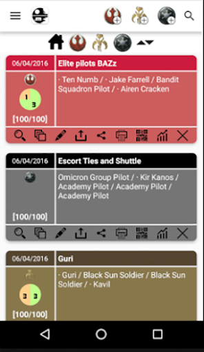 We can choose a faction and it will list all ships and pilots of that faction. We can pick any number of pilots, add upgrade cards, etc. By this way we can view the list value. The app allow us save and manage our lists for future consults, also share it on social networks or email.