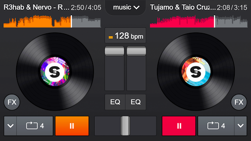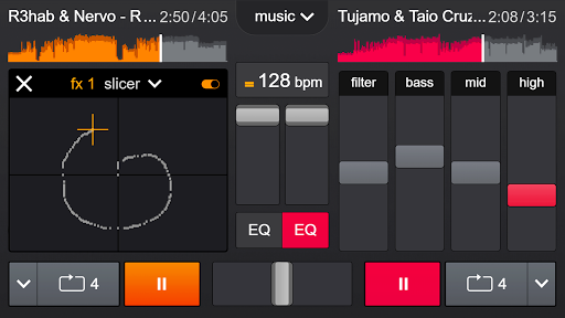 To spice up your mix, you can use effects such as the loops, the fx pads, the eq, the scratch, the sampler, the hot cues...