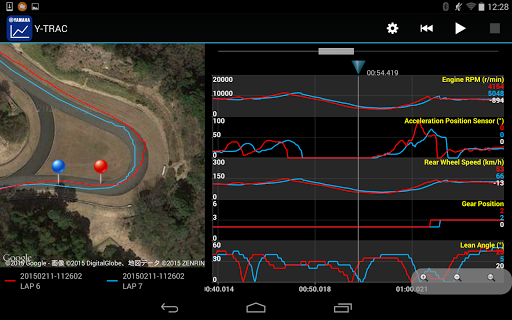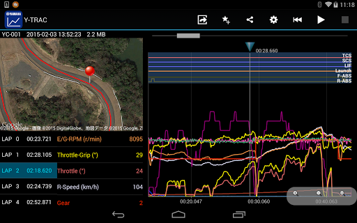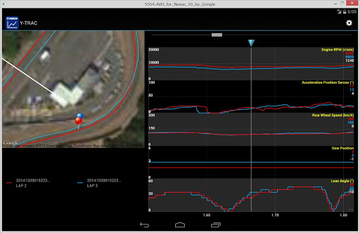 Y-TRAC is a log viewer application for viewing vehicle information collected in the CCU (* 1). Many kinds of vehicle information are displayed visually in an easy-to-understand graph, such as vehicle speed and engine speed, accelerator opening, banking angle and brake pressure, as well as various types of control effects. In addition to vehicle information, position information is recorded simultaneously in the log data stored in the CCU. Due to this synchronization of position information and vehicle condition, you can quickly pick up information such as braking point at corner entry, brake pressure, vehicle speed, line, banking angle at turn, and throttle condition at exit. Since the graph displays each lap, you can easily understand the characteristics of a good line. Find a way to improve your lap time through careful study of the app's features. Circuit racing becomes more and more fun because now you can compare bookmarked data with your competitors.
