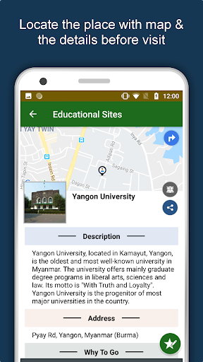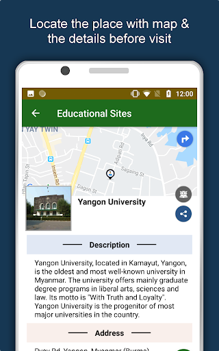 Apart from this, Yangon Travel & Explore guides you Why, When and How to visit various places in Yangon with precise location on the detailed Map. There are two ways to explore this app - Category view and EduBank favorite places view. Pin your destinations and get the routes on the Map. Not only this, you can see exactly how the places look like with Street View integrated in this app. The app also has a feature to Rate and write Review/Experience regarding entity(s) through Login. Your Travel experience and rating will help the user community.