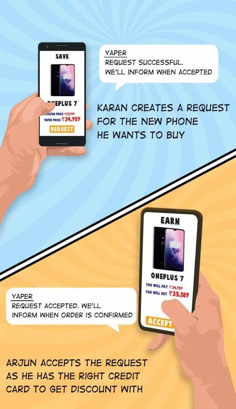 - A SAVER registers on the app, chooses any product that he wants to buy from any website and enters its URL in the YAPER app. Then he selects the best offer available for that product, enters his delivery address and creates a request