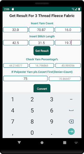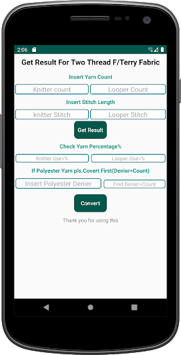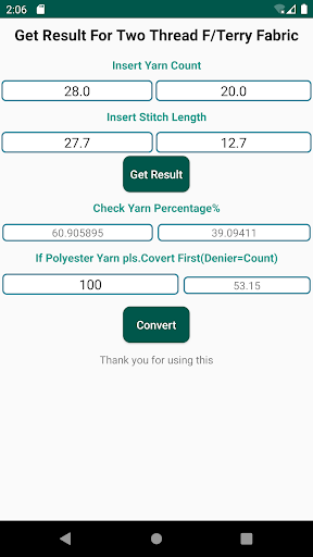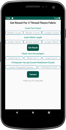 The person who knit the Fleece/Terry Fabric use two or three types of yarn. For this they have to know the percentage of yarn. This app will help them to calculate yarn percentage. So, install this app and just enjoy.